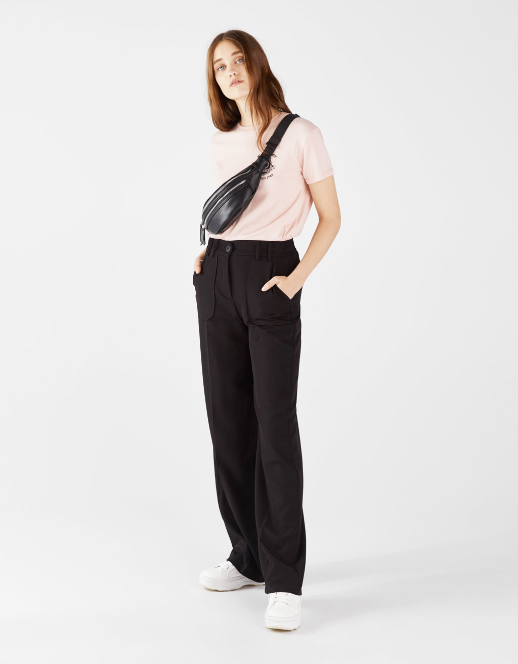– Material: Black/Brown:100% Rayon. Others:Polyester. Ruffle Waist Belted Peg Pants.